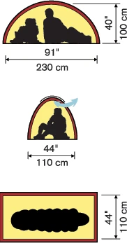 Mehrere Reißveschlussläufer an den Eingängen des Innen- wie Außenzeltes lassen eine gute Regulierung der Belüftung zu. Eine separate Lüfterhaubeauf dem Dach schützt die Lüfteröffnungen vor Regen und Schnee. Bei gutem Wetter kann das Außenzelt vorne wie hinten für noch bessereBelüftung etwas hochgerollt werden - Abspannungen:Der Aufbau erfordert keine Heringe, aber 12 Befestigungspunkte stehen bei Bedarf zur Verfügung: an den Ecken, für die beiden doppelten Leinenbefestigungen an jeder Stange sowie die beidseitigen Abspannleinen und Heringsringe in der Mitte der hinteren Langseite und dem vorderen Eingang.