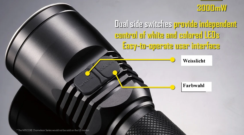 Blaulicht zum Erkennen dunkler Farben im Dunkeln, z.B. Blut bei Jagd-Nachsuche) - zwei beschriftete Taster vorne am Lampenkopf zur direkten Wahl der Lichtfarbe