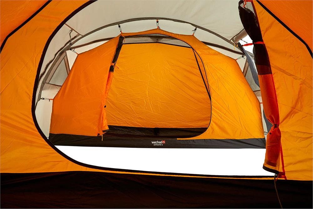Die Schlafkabine lässt sich im aufgebauten Zustand ein oder aushängen, somit kann man die Apsis ganz nach belieben vergrößern. Der D-förmige Innenzelteingang besteht im oberen Drittel aus Moskitonetz. Innenzelttaschen und ein Gearloft aus Moskitonetz bieten schnellen Zugriff für rasch benötigte Kleinteile. Das Intrepid 5 besitzt zwei Seiteneingänge, die bei geschlossenen Seitentüren einen exzellenten Wind- und Wetterschutz bieten. Die vier Apex Lüfter am Außenzelt sorgen für bestmögliche Ventilation. Das Zelt hat eine aerodynamisch günstige Form und ist dadurch sehr windstabil.