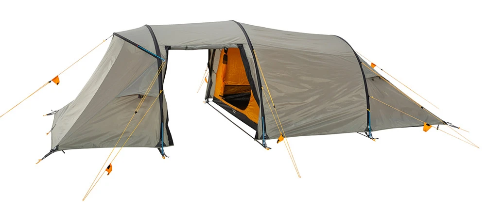 Das Intrepid 5 ist ein Zelt für bis zu fünf Personen mit zwei regengeschützten Eingängen und einer großen Apsis. Es hat drei durchgehende außenliegende Flachkanäle. Diese sind gut zu handhaben, bieten kaum Windwiderstand und minimieren so die Windgeräusche. Die zusätzliche Schlafkabine hat eine ausreichende Liegelänge für eine Person. Die Bügelhalterkonstruktion schafft mehr Platz in der Kabine, damit die gesamte Fläche der Kabine optimal nutzbar ist.